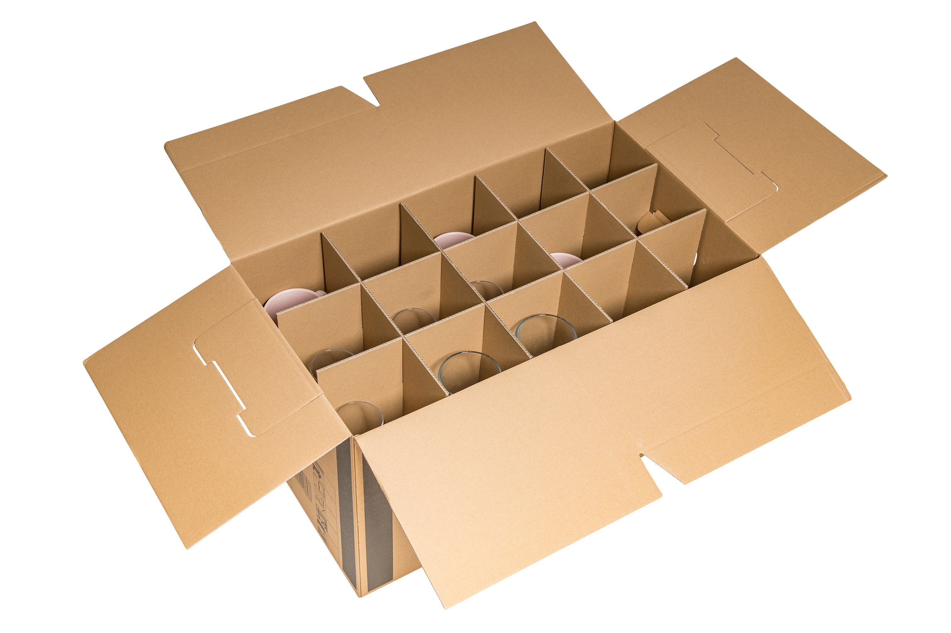 erfolgt flach verpackt. Stabile Grifflöcher ermöglichen den leichten Transport der gefüllten Boxen.